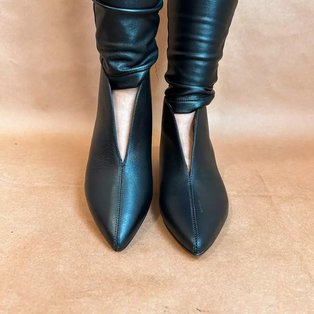 Modelo diferenciado de bota, com abertura frontal e design minimalista. Salto baixo, bico fino e couro preto. Modelo versátil para o inverno e em dias mais quentes, podendo ser usado em várias produções deixando o look elegante mesmo sem o salto alto.