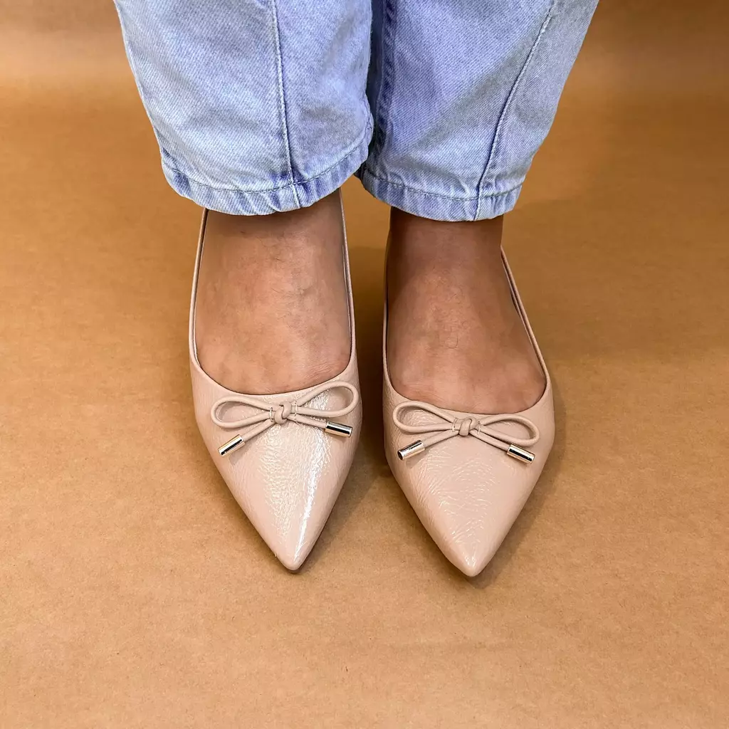 Descubra a sofisticação da Sapatilha Nude com bico fino clássico, adornada por um delicado laço e acabamento em verniz que realça sua elegância. O salto dourado proporciona um toque de luxo discreto, perfeito para ocasiões que exigem charme sem abrir mão do conforto. Ideal para compor looks refinados com um toque moderno.