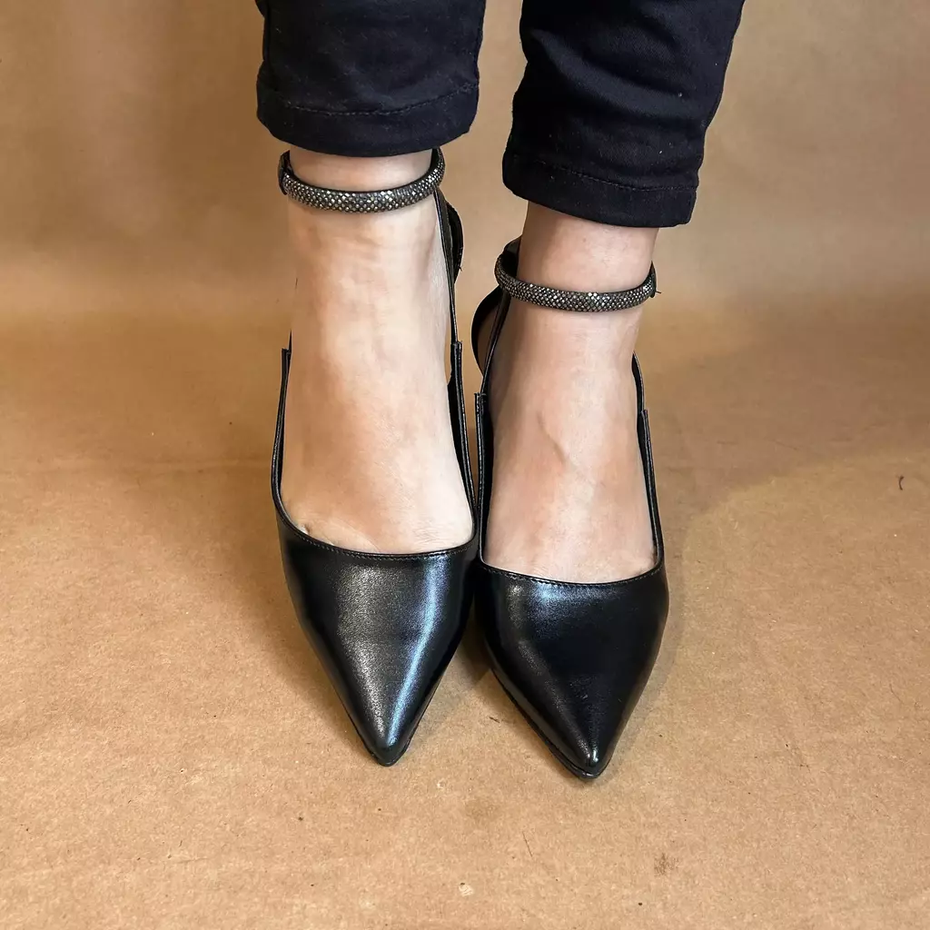 Um sapato de salto bloco que une sofisticação e conforto com maestria. Seu bico fino ressalta a elegância, enquanto o delicado detalhe com brilho no tornozelo acrescenta um toque de charme e firmeza. Ideal para quem busca um modelo confortável sem abrir mão do estilo, é perfeito para ocasiões que exigem requinte e delicadeza.