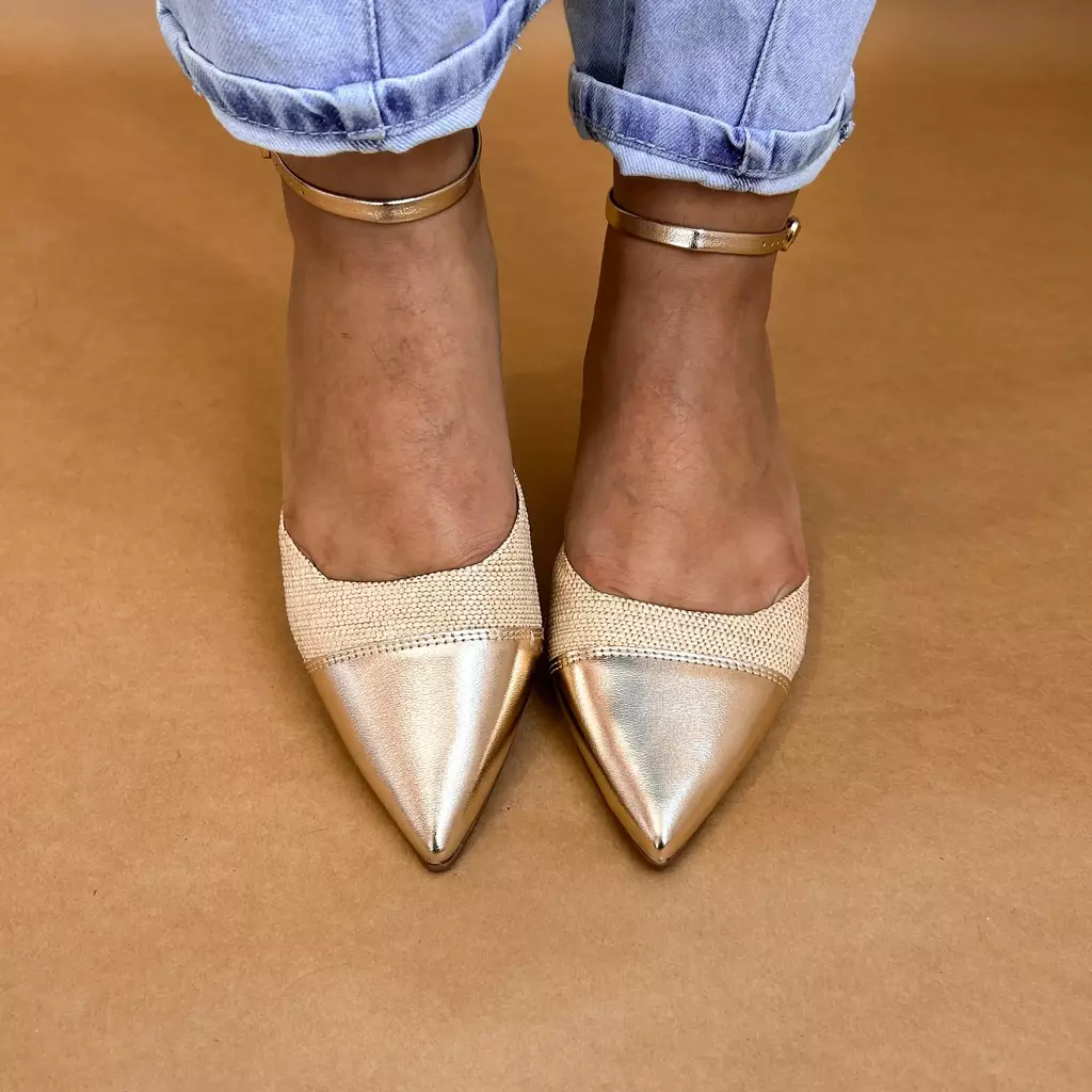 Sapato dourado Velvi — um modelo que combina elegância e conforto em cada detalhe. Com bico fino e acabamento metalizado, ele traz um toque sofisticado e moderno ao visual. O detalhe tramado na parte frontal adiciona charme e textura, enquanto a tira ajustável no tornozelo garante firmeza e um encaixe perfeito. Uma escolha versátil para produções que vão do dia à noite com muito estilo.