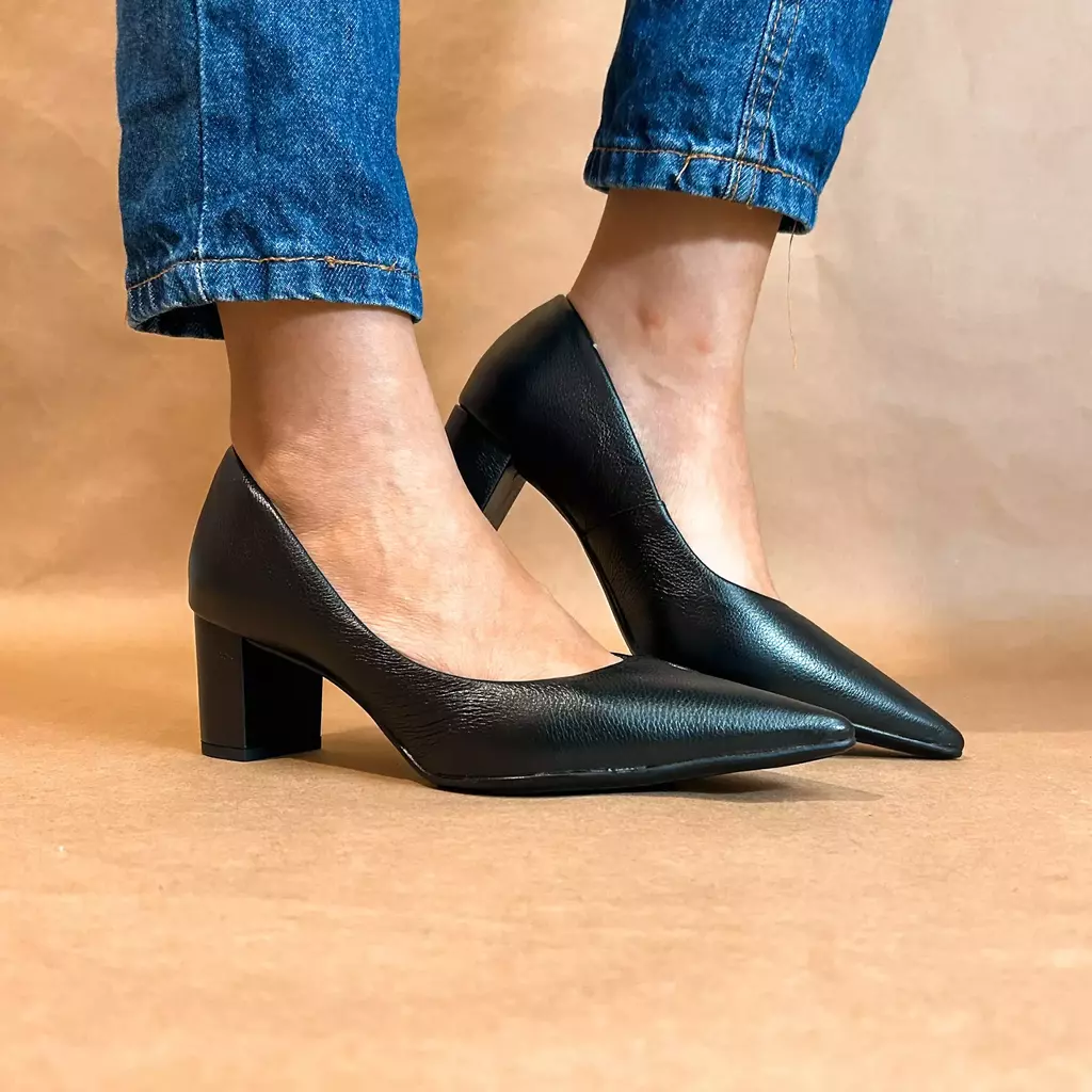 Descubra o clássico sapato de salto bloco com bico fino, uma peça que une elegância e praticidade. Confeccionado em couro macio, oferece conforto superior com sua palmilha acolchoada, ideal para o uso diário ou ocasiões especiais. O salto médio de 6cm proporciona estabilidade e um visual sofisticado, enquanto o design clássico e o bico fino adicionam um toque de refinemento ao seu look. Versátil e atemporal, é a escolha perfeita para quem busca conforto sem abrir mão do estilo.
