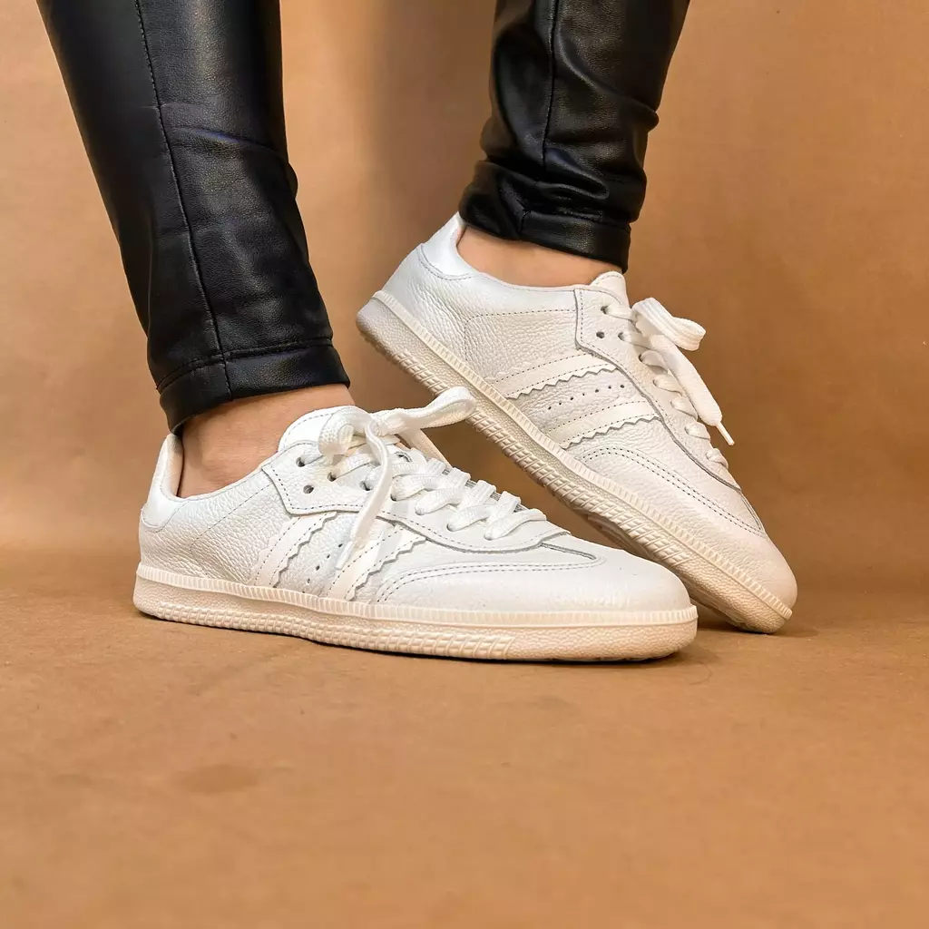 Com solado reto e baixo, este modelo é inspirado no icônico Samba da Adidas, trazendo a combinação perfeita entre estilo e conforto. Feito em couro macio, proporciona um toque suave e durabilidade para o uso diário. Ideal para quem busca um visual autêntico com a versatilidade do branco, fácil de combinar com diversos looks.