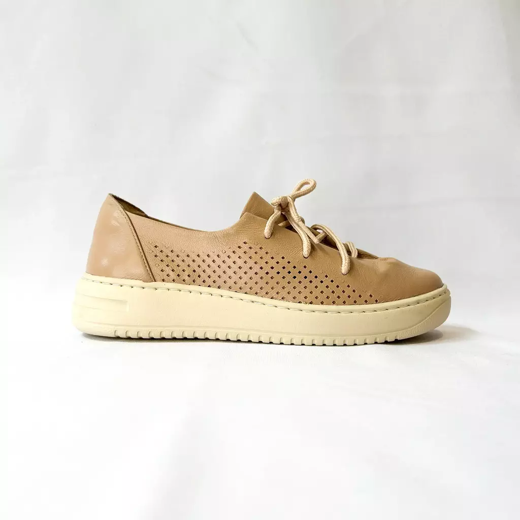 Um tênis leve e macio, a perfeita combinação de elegância e conforto. Confeccionado em couro super macio na delicada cor nude, com solado off-white, apresenta pequenos furos no couro e um charme exclusivo no detalhe “enrugado” em cima do pé. O solado leve proporciona conforto prolongado, enquanto o cadarço funciona como um enfeite e ajuste sutil, realçando o estilo básico e sofisticado. Ideal para quem busca conforto e praticidade no dia a dia.